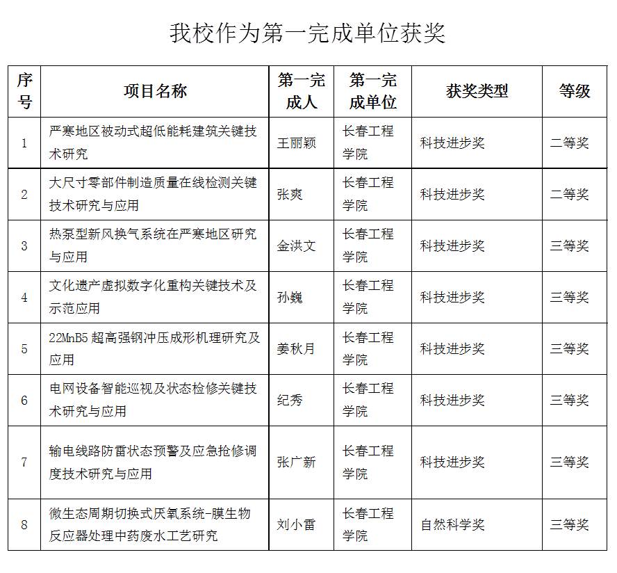 日前,吉林省科技厅公布了《心博在线平台(中国)官网授予2019年吉林省科学技术奖的决定》。我校设计院王丽颖申报的项目“严寒地区被动式超低能耗建筑关键技术研究”与机电工程学院张爽申报的项目“大尺寸零部件制造质量在线检测关键技术研究与应用”获得科技进步二等奖;能源动力工程学院金洪文等申报的项目获得科技进步三等奖5项;水利与环境工程学院刘小雷申报的论文获得自然科学三等奖1项;水利与环境工程学院边德军与其他单位合作申报的项目获得科技进步二等奖1项。