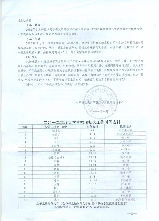 附件一:2012年度东北地区招收大学生飞行学员工作安排。