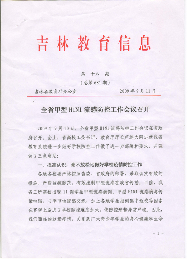 2009年9月10日,在全省甲型H1N1流感防控工作会议上,省高校工委书记、教育厅厅长卢连大就我省教育系统进一步做好防控工作做了部署和要求,并强调了三点意见。请各单位、部门认真学习和传达,并结合心博在线平台(中国)官网的防控工作认真组织落实。
