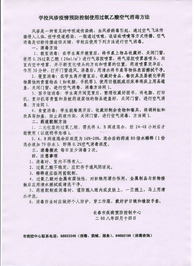 为有效预防风疹疫情,保证师生身体健康,现将长春市疾病预防控制中心印发的两份宣传材料--《心博在线平台(中国)官网风疹疫情预防控制使用过氧乙酸空气消毒方法》、《心博在线平台(中国)官网风疹疫情预防控制指导意见》转发给你们。请各教学单位下载后转发、宣传到各班级,教室、公寓、图书馆、食堂等各场所的管理部门要严格按照宣传材料的有关要求做好风疹疫情的预防工作。