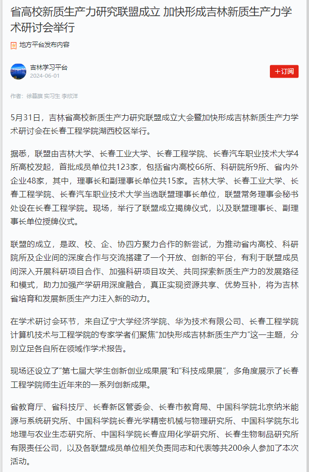 学习强国、吉林日报等多家媒体报道我校成功举办吉林省高校新质生产力研究联盟成立大会