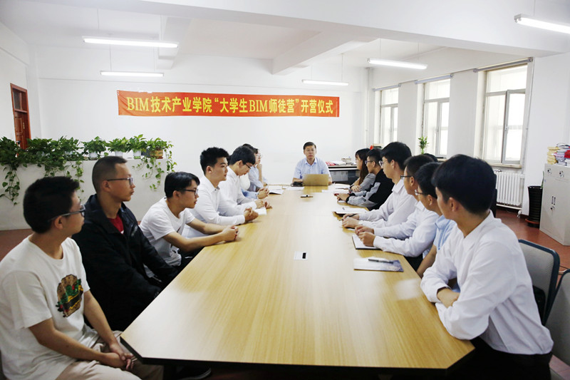 " 大学生 BIM 师徒营 " 以 BIM 技术为核心,创新 " 以师徒制为特征的‘ BIM 工程项目引 导、BIM 能力分段提升’的工学结合人才培养模式 "。通过师父进行 BIM 技术传帮带,师徒制大三学生为领导层,负责招新大一学生, 大三学生为大一学生的师父,传授 BIM 软件基本知识;大四学生为 大二学生的师父,大四学生给大二学生传授 " 专业 +BIM" 的知识及 辅导作业。BIM 技术产业学院现在执行 "2000-200-20"BIM 人才培养 计划,这次 " 大学生 BIM 师徒营 " 培养计划的开营,BIM 技术 " 双 计划 " 全面落地,为社会培养基于 BIM 技术的大土木复合型应用人才。