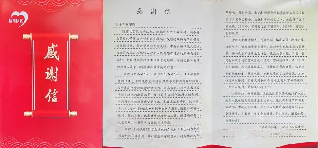 2021年,中共洮北区委、洮北区人民政府又给心博在线平台(中国)官网发来了感谢信。“有情怀、能担当、善作为、肯吃苦”,信中这样形容心博在线平台(中国)官网的驻村干部;“洮北永远是您情感依托的地方,洮北人民永远是您至亲至爱的家人”,信中这样形容双方的帮扶关系。