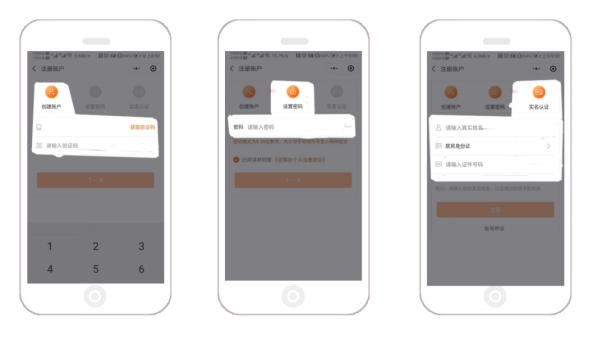 ②完成注册并登录:填写注册手机号码,点击“获取验证码”按钮,在“验证码”一栏填写收到的短信验证码,点击“下一步”进行密码设置及实名验证。填写真实姓名及身份证号码,点击“注册”按钮完成注册并成功登录。